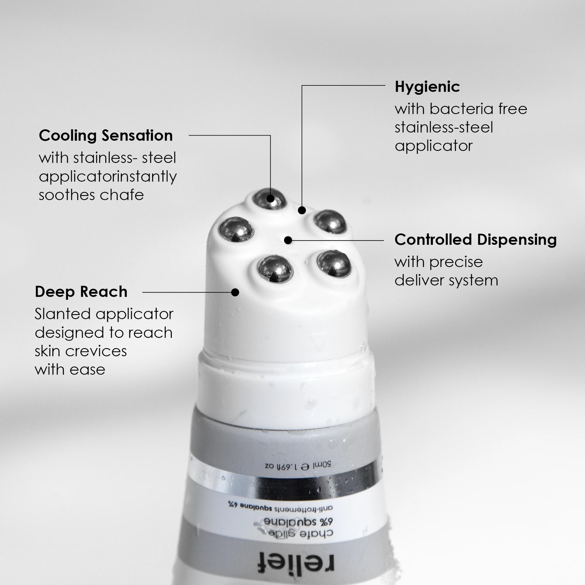 The 5-over-5 stainless steel applicator is, designed to provide precise application with just a pea-size amount.